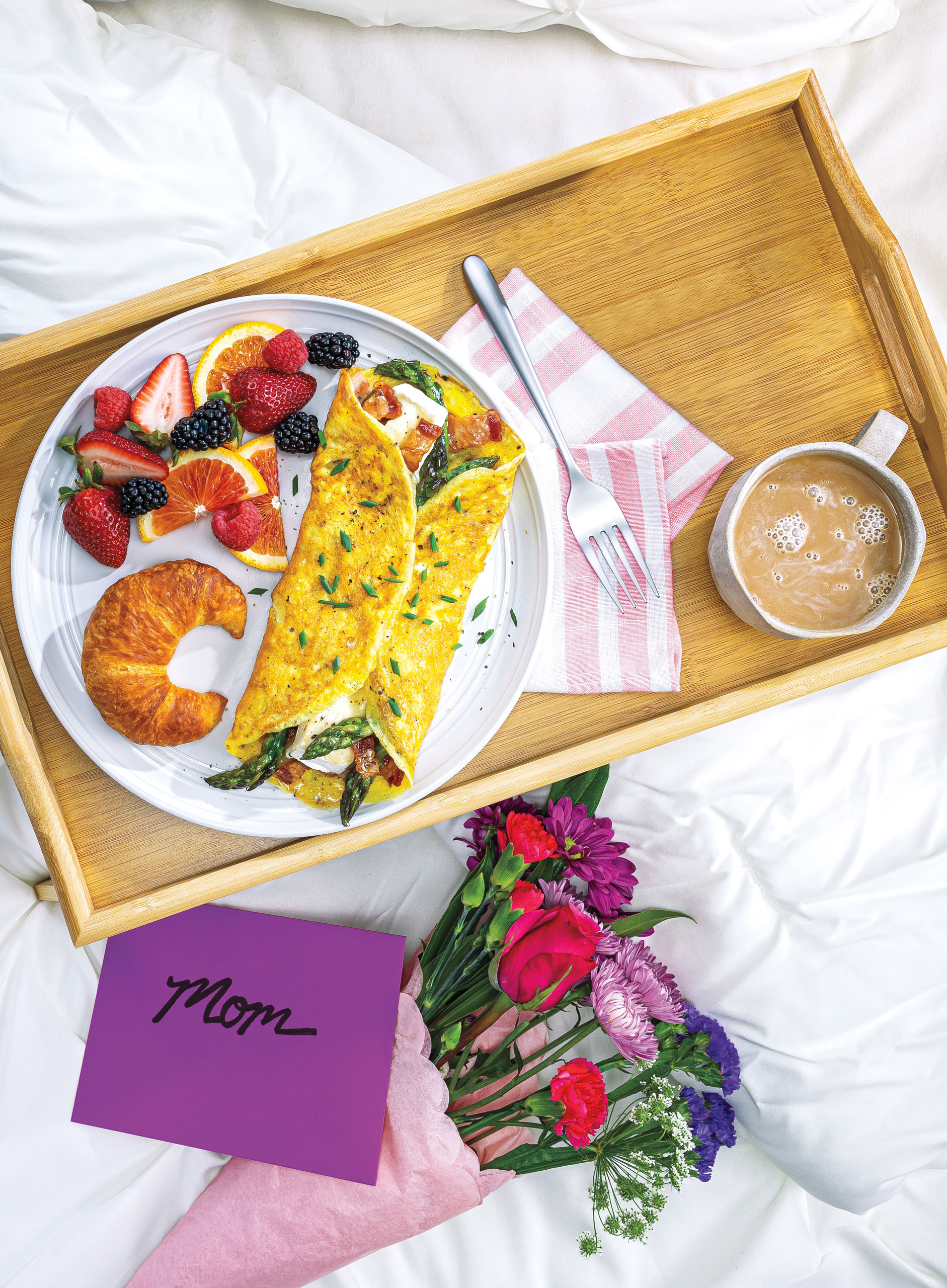 - In small, nonstick skillet, melt 1 tablespoon butter over medium heat. Add about ⅓ cup egg mixture; cook 1 minute or until eggs begin to set. Lift edges of omelet with rubber spatula as it cooks, allowing uncooked eggs to run underneath; cook 1 minute or until bottom of omelet is set, but top is still slightly wet. Add ¼ cup bacon mixture and 2 slices cheese down center of omelet; fold 1 side of omelet towards center over filling, then tilt pan to roll omelet, seam side down, onto plate. Repeat with remaining butter, egg mixture, bacon mixture and cheese to make 3 additional omelets. Makes 4 omelets.