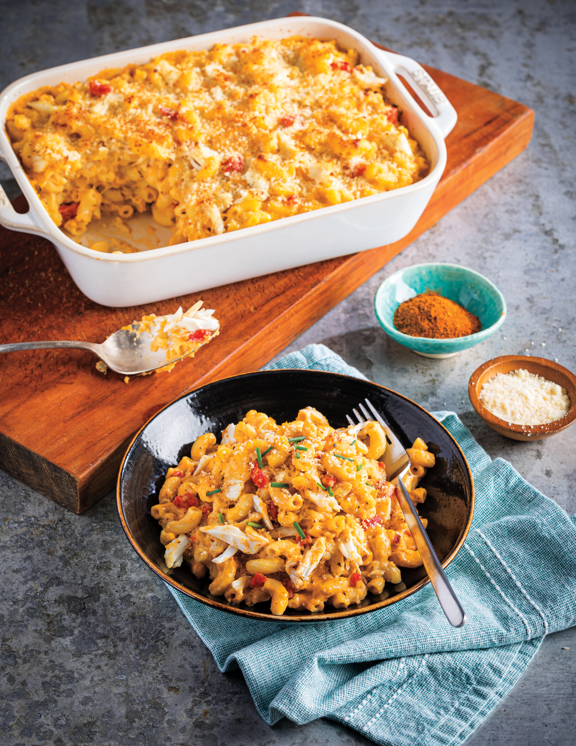 - in large saucepot, melt butter over medium heat; add flour and cook 2 minutes, whisking constantly. Add milk mixture; heat to a boil over medium -high heat, whisking constantly until smooth and thickened. Gradually add Cheddar cheese, stirring until smooth and creamy; remove from heat. Fold in red peppers, crabmeat and macaroni; transfer to prepared dish. Makes about 10 cups.