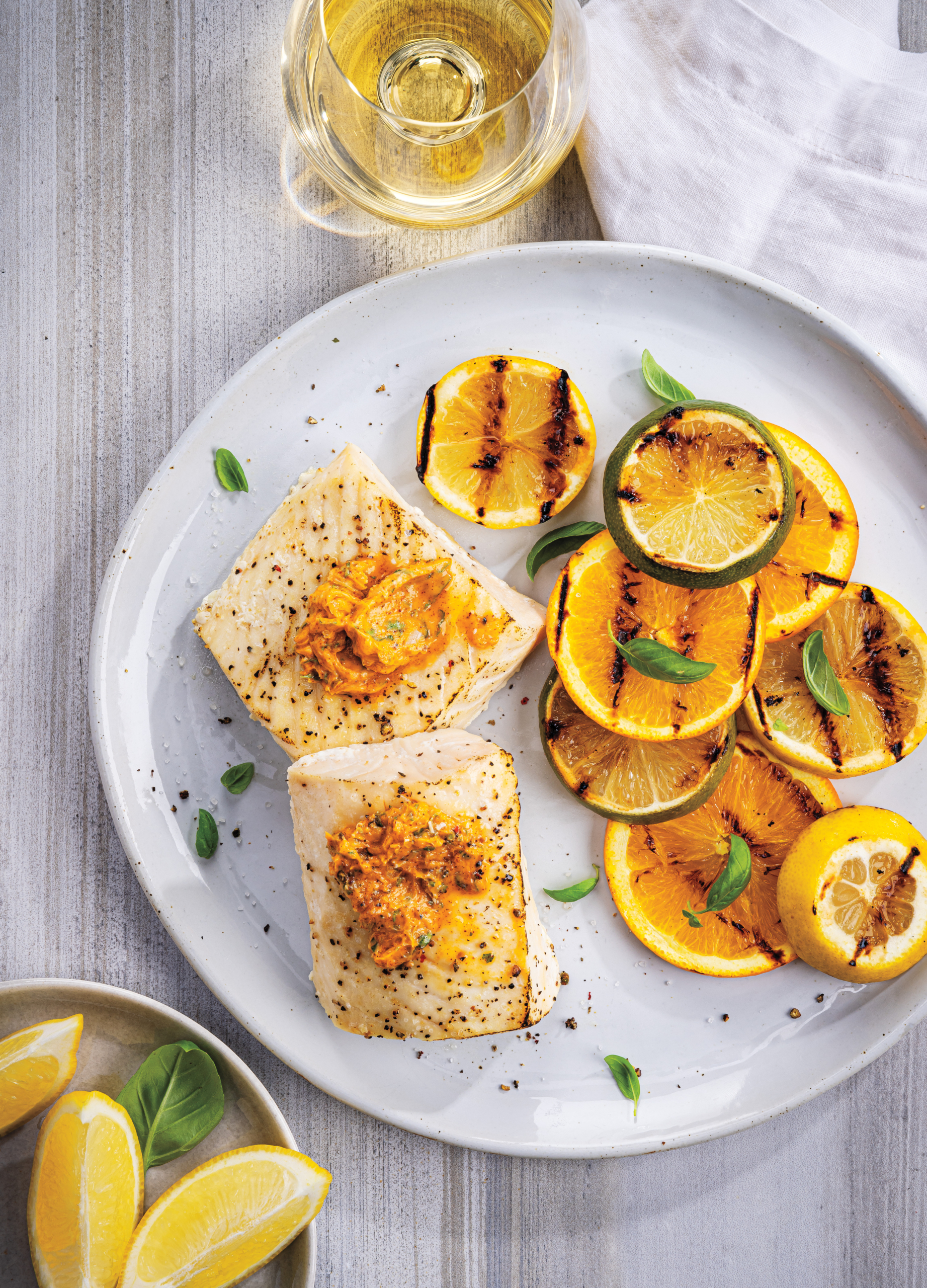 - Sprinkle both sides of cod with remaining ¼ teaspoon salt and pepper. Alternately place lemon slices, lime slices and orange slices in an 11 X 8-inch rectangle on hot grill rack; place cod on top of fruit slices, cover and cook 15 minutes or until internal temperature reaches 145°.