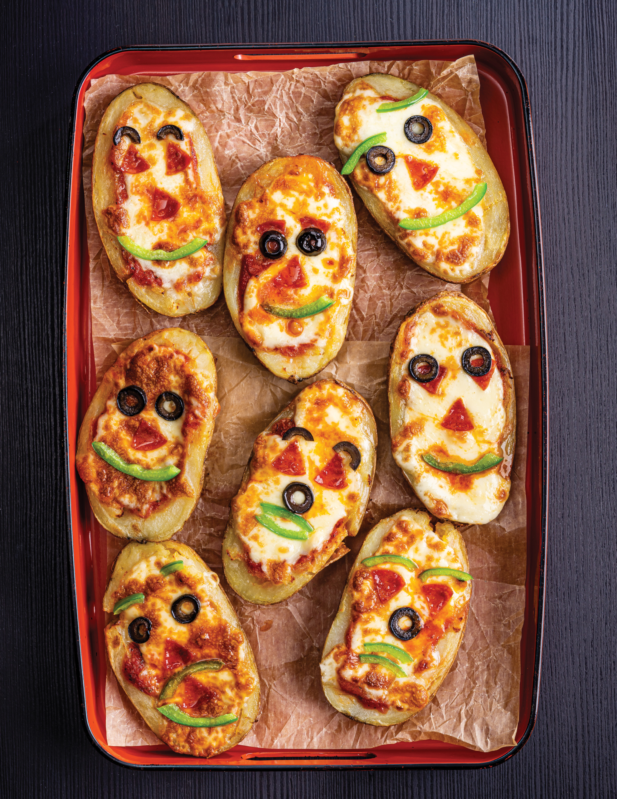 - Top potato skins with pizza sauce and cheese; arrange pepperoni, pepper and olives over cheese to create desired jack-o’-lantern faces. Bake 15 minutes or until heated through and cheese melts. Makes 8 potato skins.