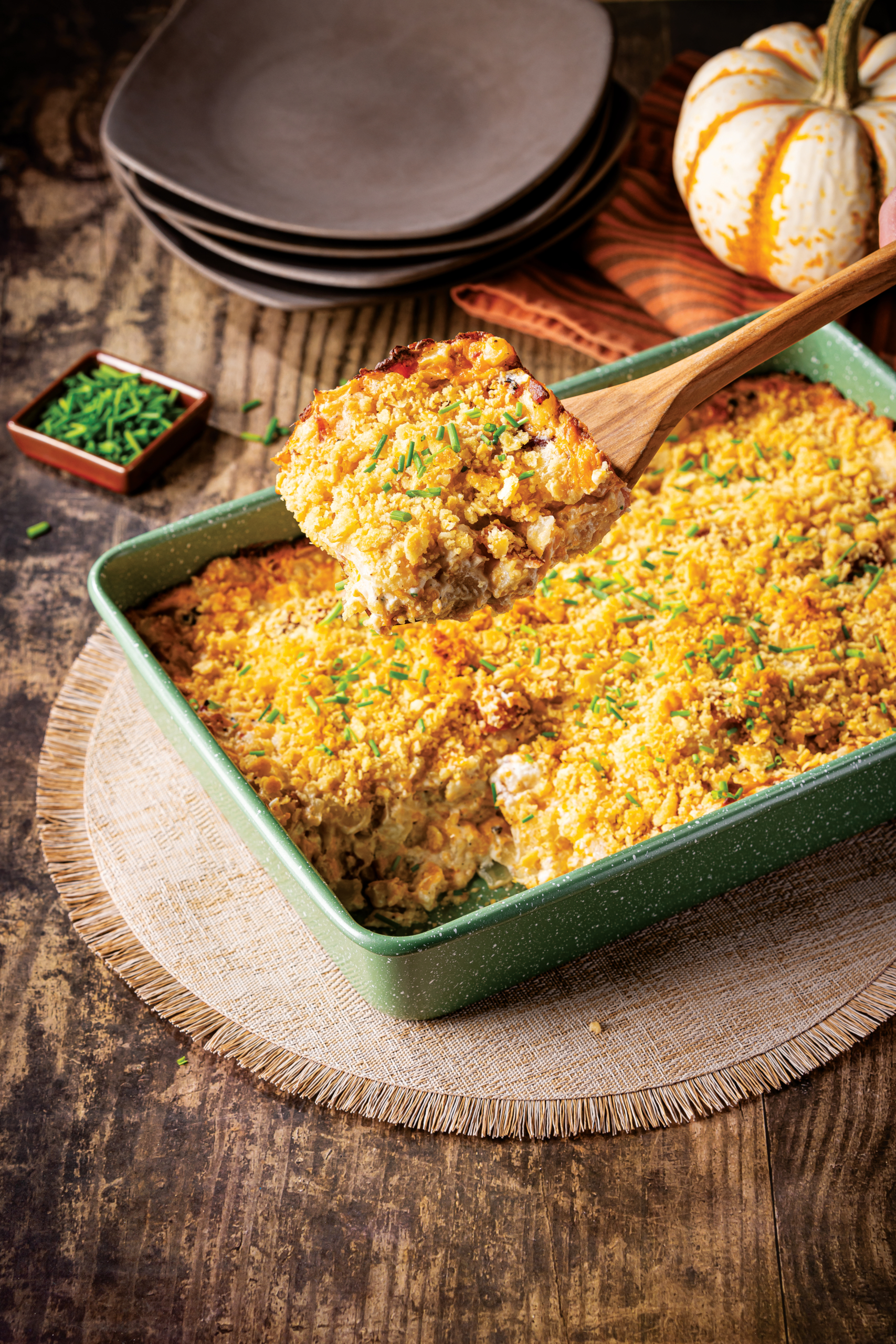 - Serve casserole garnished with chives, if desired.