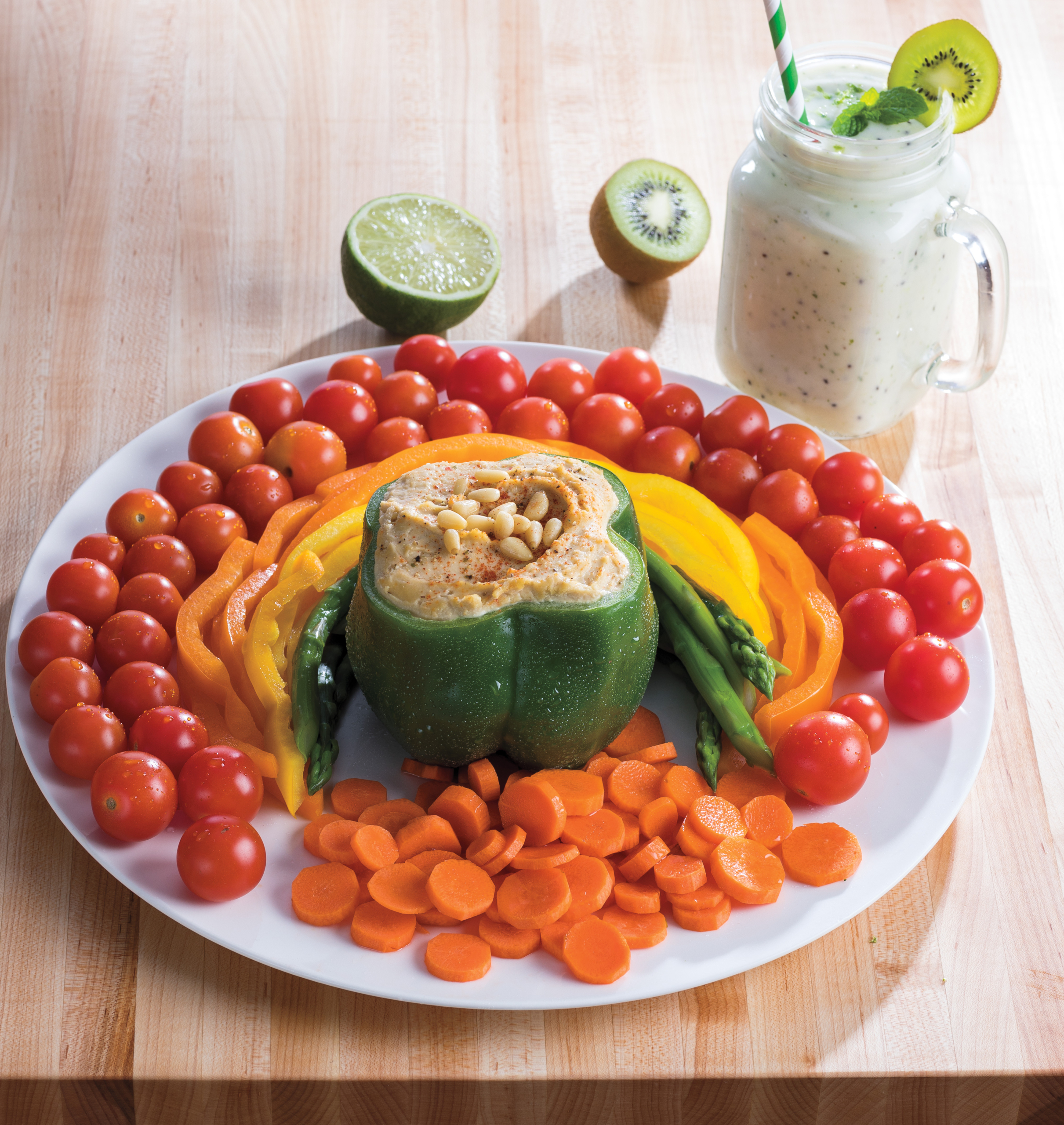 - Slice ½-inch off top of green bell pepper and remove seeds; fill with hummus and place in center of serving plate.