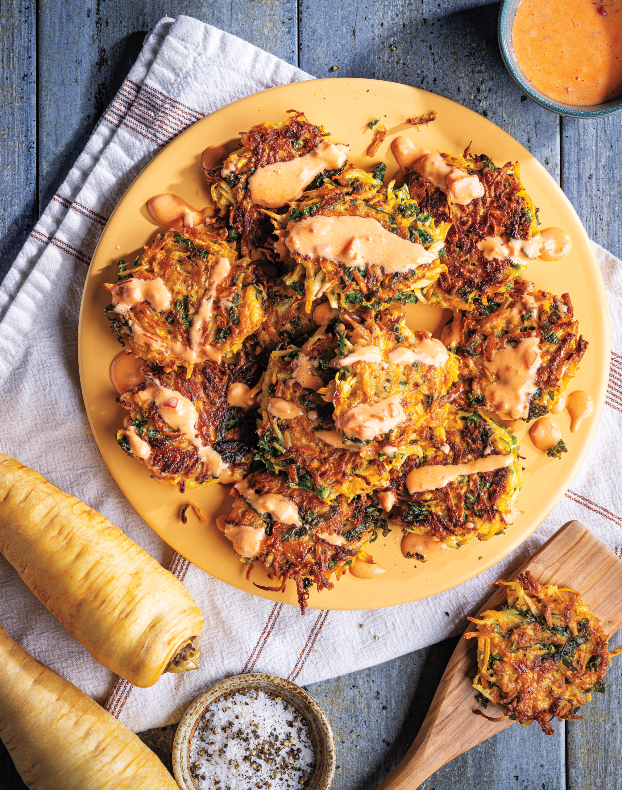 Root Vegetable and Kale Latkes with Honey-Harissa Aioli