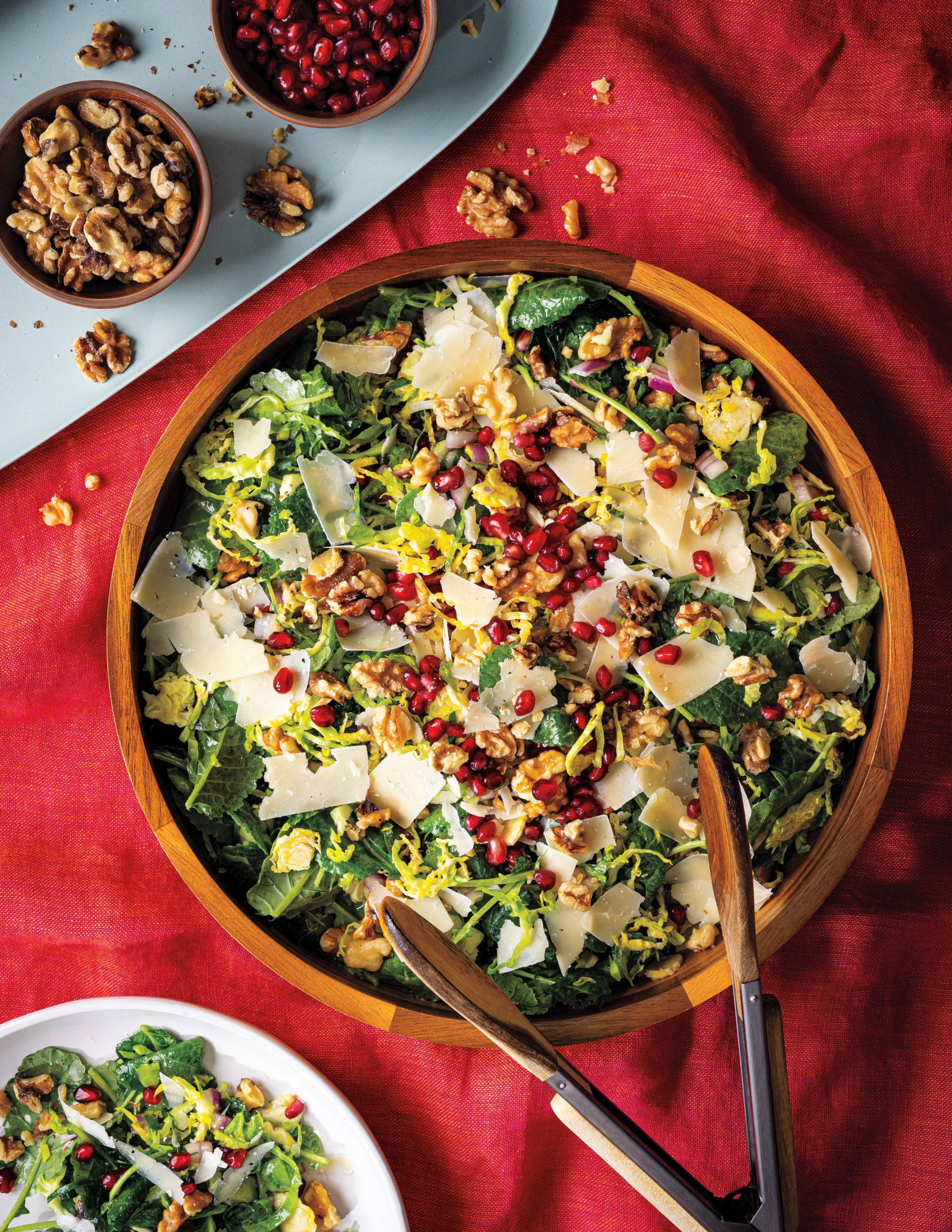 - In large serving bowl, toss Brussels sprouts, kale and dressing; serve topped with cheese, walnuts and pomegranate arils. Makes about 10 cups