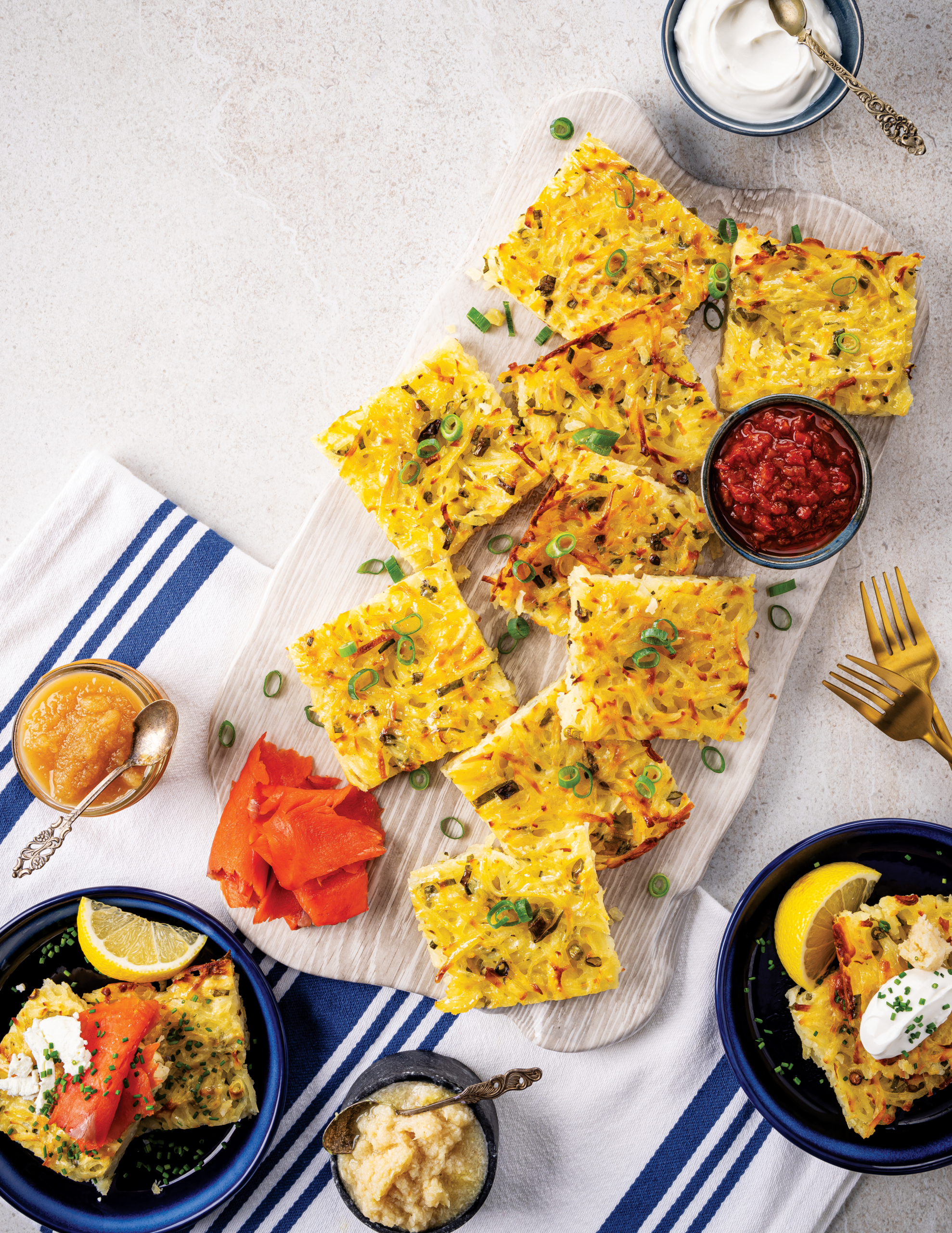 - Applesauce; crumbled goat cheese + harissa; smoked salmon + chèvre + sliced chives; smoked salmon + horseradish + sour cream for serving (optional)