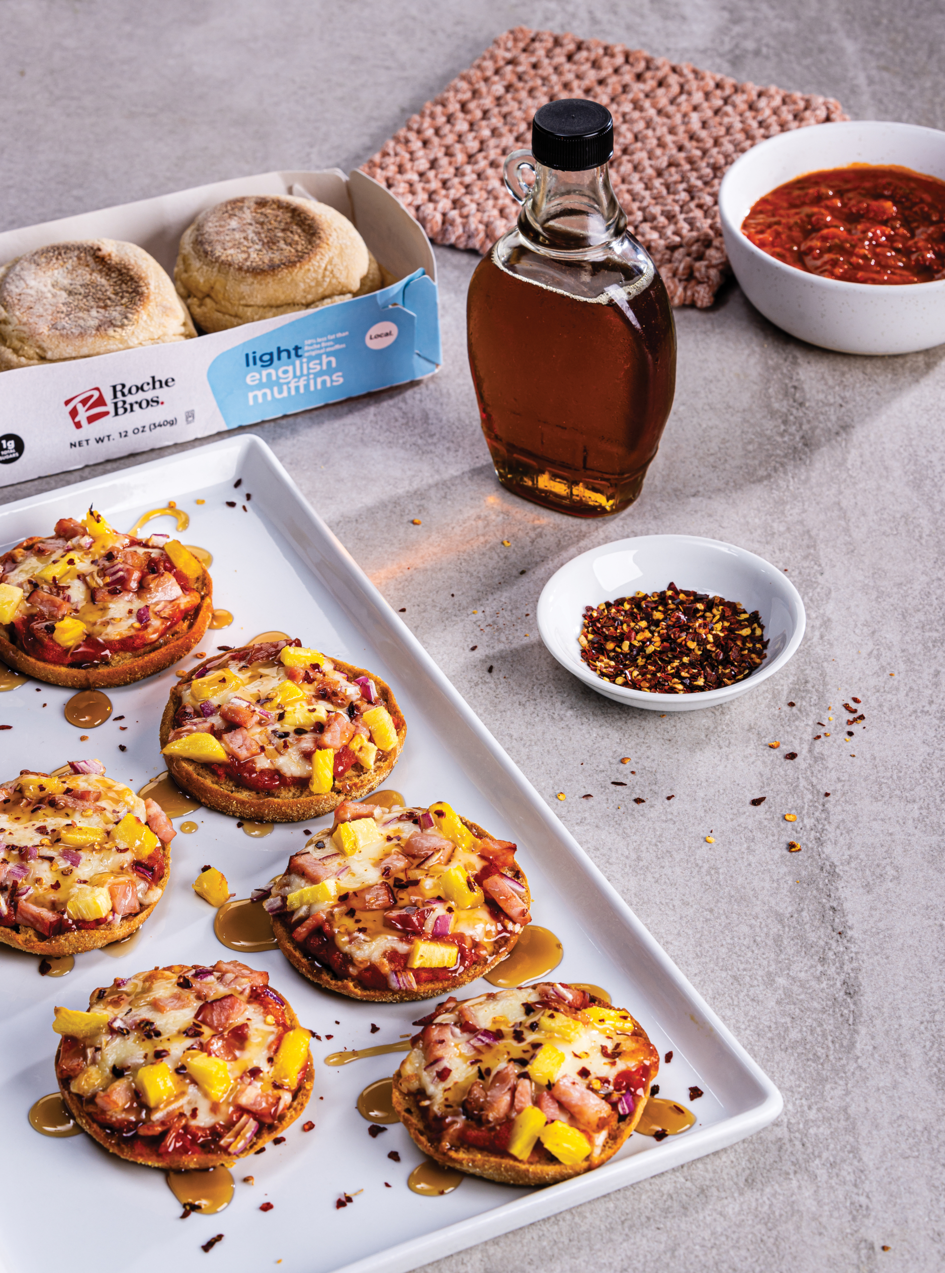 - Place muffins, cut side up, on prepared pan. Spread pizza sauce over muffins; sprinkle with cheese, pineapple, onion, bacon. Bake pizzas 5 minutes or until cheese is melted. Makes 12 mini pizzas.